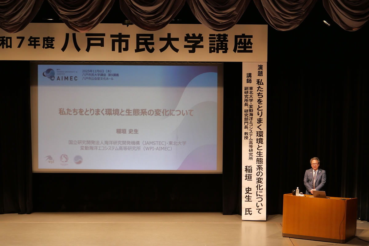 2025年11月6日(木)に、八戸市の「SG GROUP ホールはちのへ」にて、令和7年度 八戸市民大学講座 第9講義「私たちをとりまく環境と生態系の変化について」が開催され、WPI-AIMEC稲垣 史生 副所長(研究部門長・教授)が登壇しました。