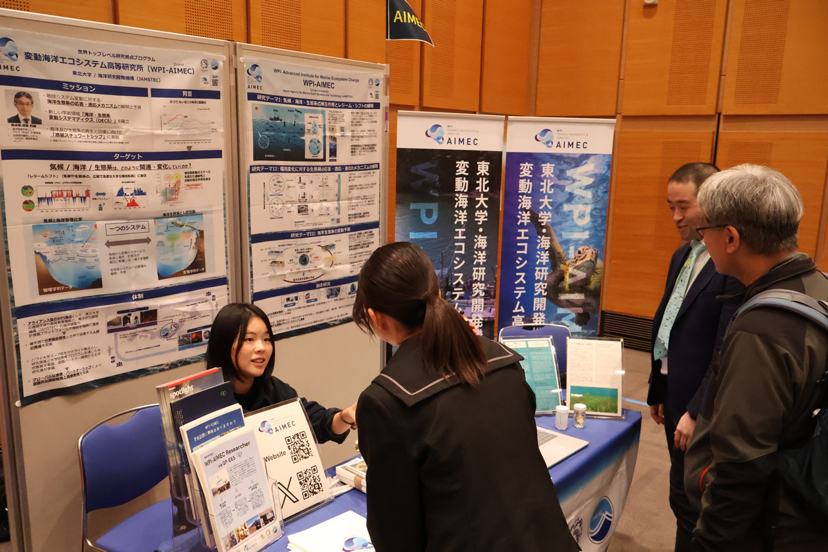 Tohoku University PhD student Tatsuki Ueyama, who is supported by the JST-ASPIRE Program, presented a poster on the topic of ocean memory. WPI-AIMEC Postdoctoral Fellow, Zhen Lin (Specially Appointed Research Fellow, Tohoku University) gave a keynote on using Earth System Models to study how ocean currents influence nutrient flow and ecosystems. At the exhibition booth, visitors were invited to reflect on the future of the ocean by answering a guiding question. The booth also displayed two fish species and their cultural significance in the Tohoku region. Students and teachers interested in marine research and biology also visited the booth and asked questions about the use of marine ecosystem prediction and school outreach.