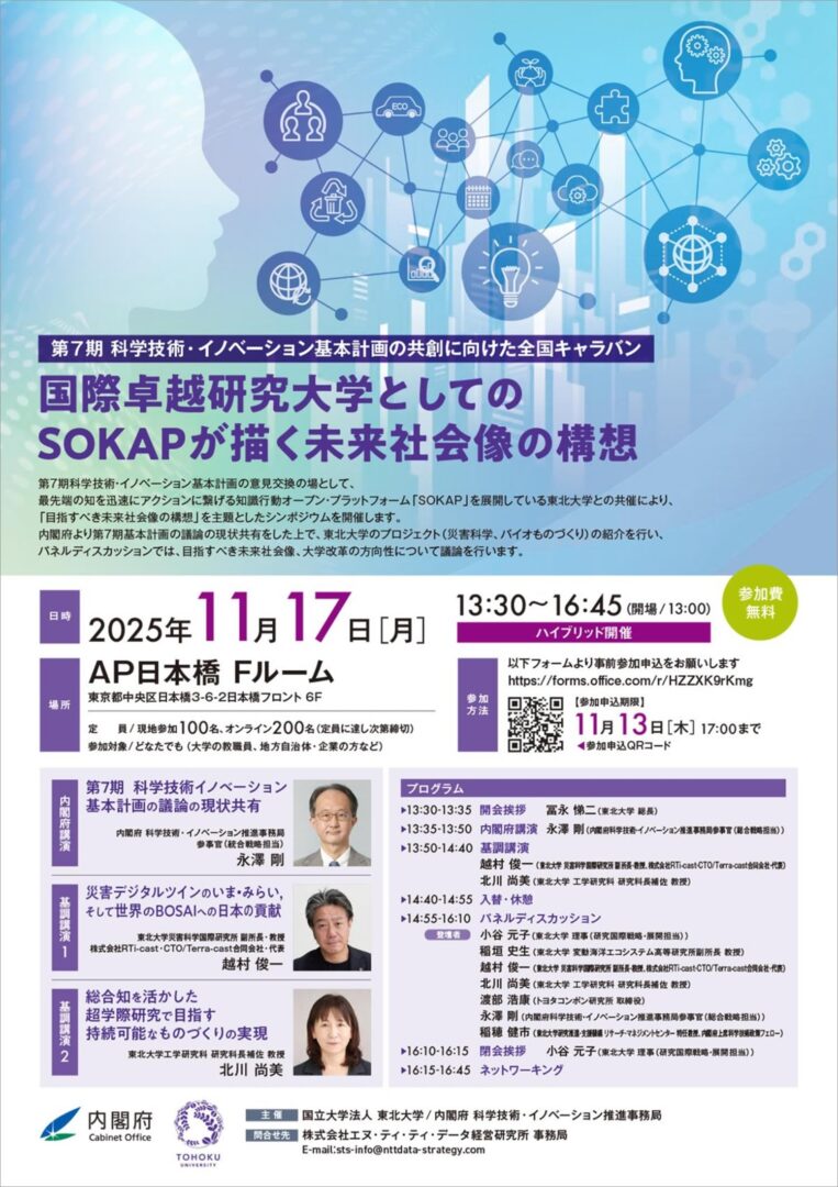 This symposium is co-hosted by Tohoku University and the Cabinet Office, providing a venue for exchanging views on the 7th Science and Technology and Innovation Basic Plan. The event highlights SOKAP, a Knowledge-Action Open Platform designed to rapidly translate cutting-edge knowledge into action.