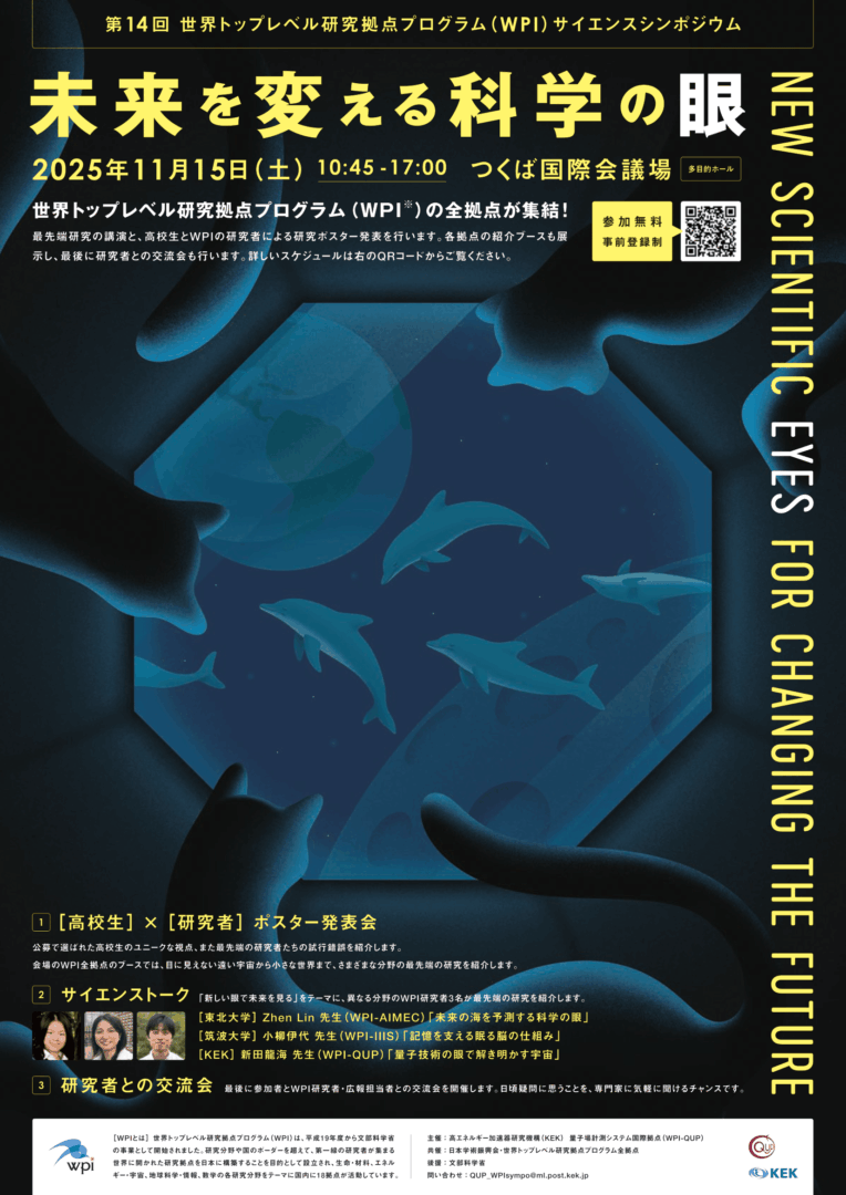 The 14th WPI Science Symposium, “Science’s Eyes for Changing the Future” will take place on Saturday, November 15 at the Tsukuba International Congress Center.