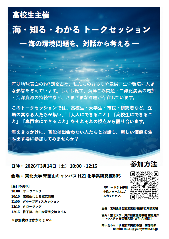 仙台第三高等学校の2年生が企画・運営し、WPI-AIMECの協力するこのイベントは、あらゆる世代・背景の人々が集まり、海の未来について共に考える場です。